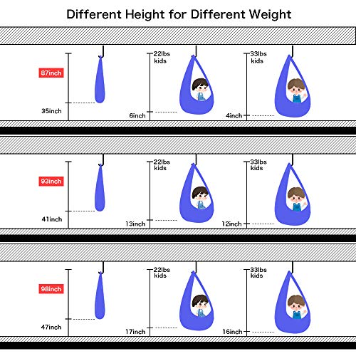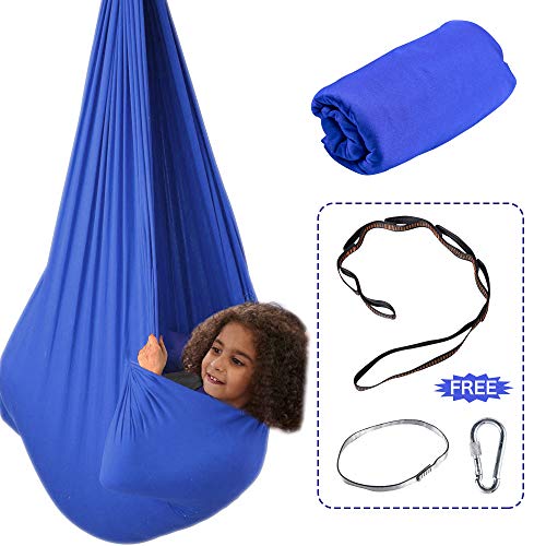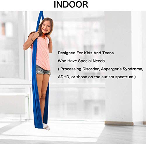[SOFT SILKY NYLON]: This therapy swing is made of high quality material–soft & silk nylon. It measures 110″L x 40W”. Kids can sit and cocoon comfortably in the hammock with a sense of calmness. Our updated hammock can block out unwanted sensory stimulation.