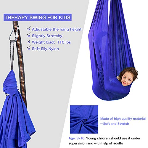 [DURABLE & SAFE]: The therapy swing comes with silk Nylon hammock, 1 Multi-loop climber strength daisy chains, 1 safety carabiner with twist lock system and 1 connecting rope. The hardware and the accessories we provide are durable, whose max load-bearing capacity is up to 110 lbs (50 kg).