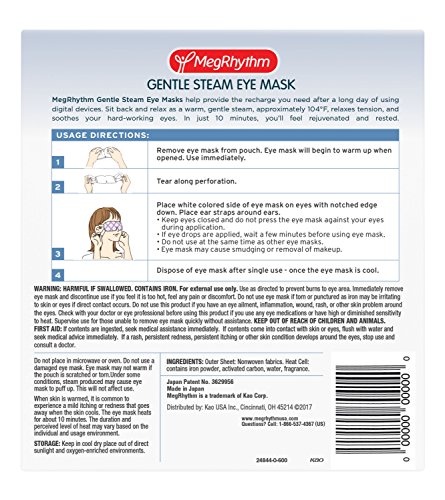 NOTE: Do not use at the same time as other eye masks or products. If eye drops have been applied, wait a few minutes before using MegRhythm Gentle Steam Eye Mask. Note that using the eye mask may cause smudging or removal of eye makeup. Can be used with temporary eyelash extensions.