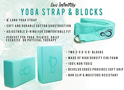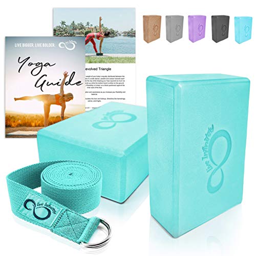 This set by Live Infinitely includes 2- 3”x 6” x 9” EVA foam blocks with easy grip beveled edges and 1- 6’ long soft cotton strap with premium metal D-rings.