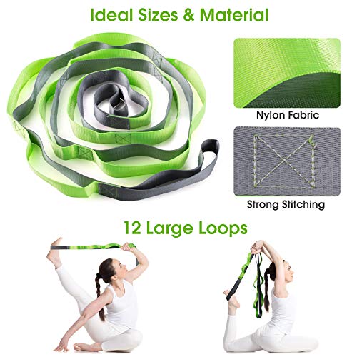 Versatility Yoga Strap with 12 Loops-Made from durable and long-lasting nylon material, 94.5 inches long and 1.2 inches wide, each loops 7 inches long, provide you with a great stretching experience.