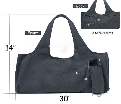 DIMENSION : Yoga mat tote is 30’’ * 14’’. Bottle holder is 8.5’’ * 3.4’’ . 2 Safe pockets in back is 7.9’’ * 4.5’’ .The detail dimension about yoga mat bag you can find in second picture of our images list.