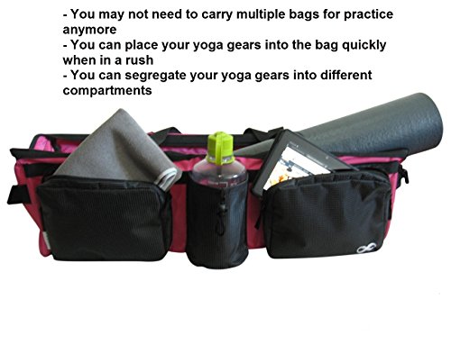 SIMPLE YET FUNCTIONAL DESIGN: Different compartments for different purpose to get organize. Two external front compartments can fit in 2 yoga blocks, 4′ x 6′ x 9′ each or enough space for your towels, kindle, books, extra shirts, yoga straps etc. One external middle compartment to store your water bottle. One zippered inside pocket for keeping your purse, wallet, handphones, membership cards, tissues and other gears. You may not need to carry multiple bags for practice anymore.