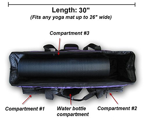 Fits most yoga mat up to 27″ wide, with enough room left for your extras EXCEPT for 15mm yoga mat)